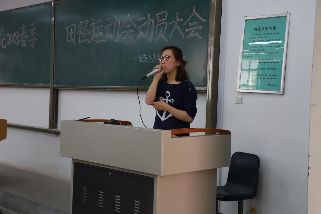 大会开始,邵巍老师向大家说明本次运动会的注意事项,要求所有同学积极参与到本次春季运动会,学院会统一配发帽子、院服,力争获得精神文明奖。此外,邵老师还强调了本次运动会期间将严格考勤,要求所有同学必须到场,并就看台纪律等做了相关要求。接着,刑烜毓老师提醒同学们要注意看台秩序,要求统一带马扎。他介绍了本次运动会期间考勤管理处罚制度。最后,院团总支书记马薏雯老师上台总结,希望同学们能够积极参与本次校级大型运动会,并采取鼓励措施,对优秀、积极进取的个人、集体颁发奖章以此鼓励,嘉奖。