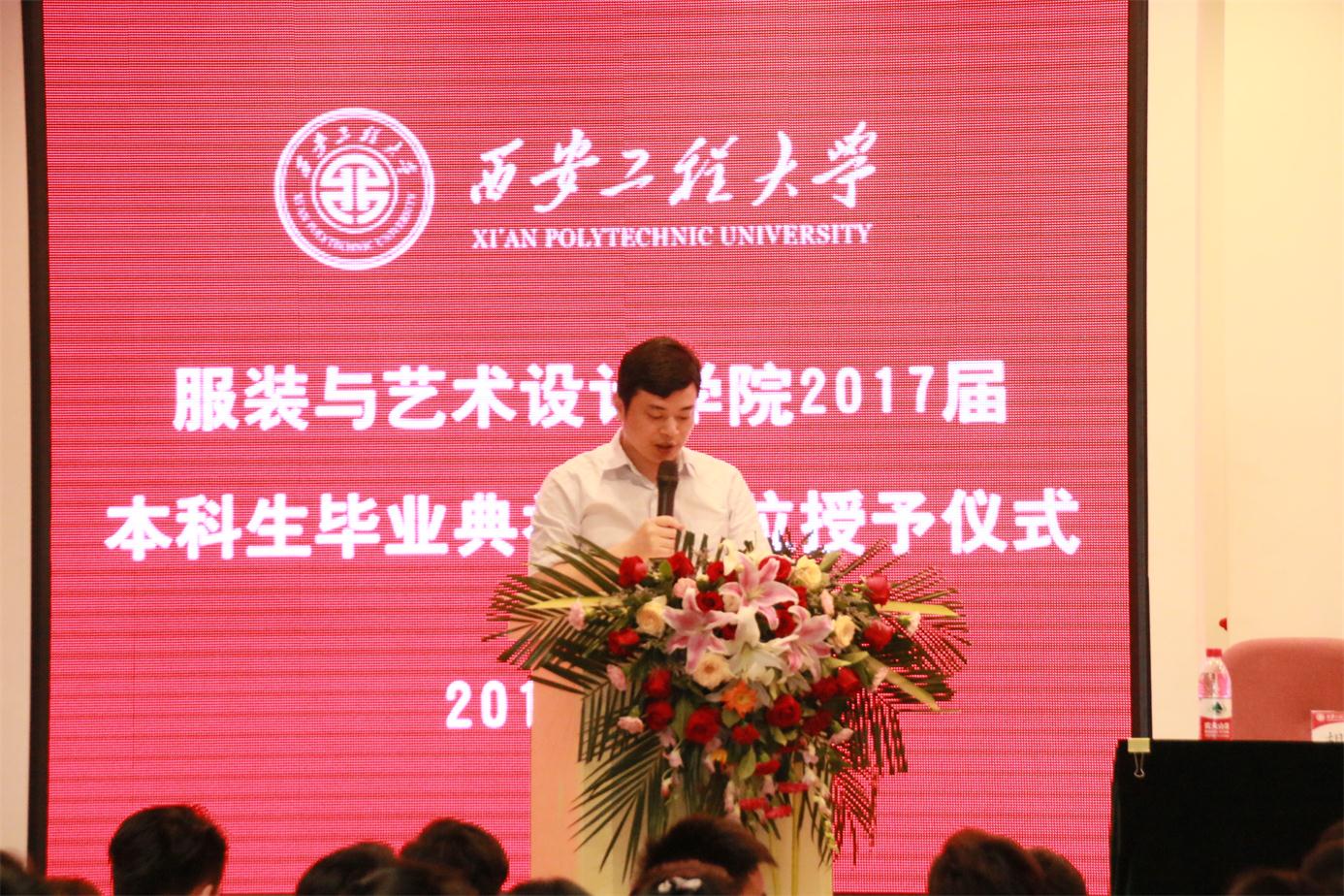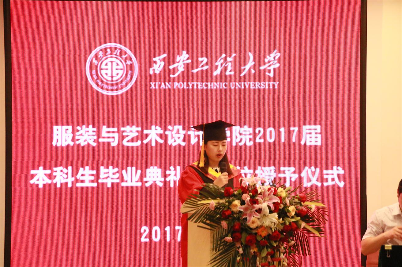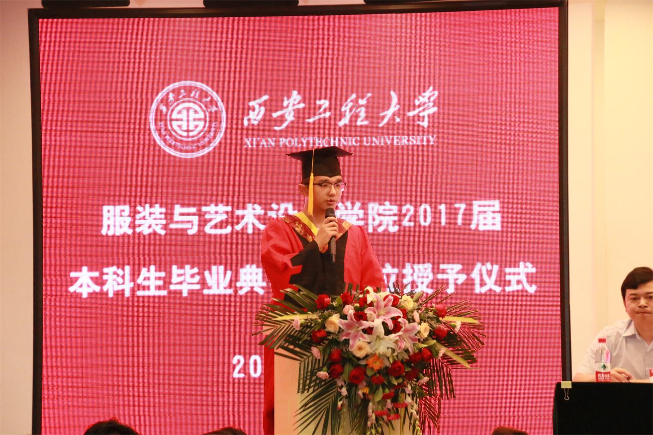 优秀毕业生代表服装表演专业任子瑜、产品设计专业孙伟一、环境设计专业王丹青分别发言,他们代表全体毕业生对所有老师在大学四年里的辛勤培育表示衷心的感谢,并表示今后一定会不负老师嘱托,继续在各自的岗位上认真学习、努力工作,成就精彩人生,用成绩向学院汇报。
