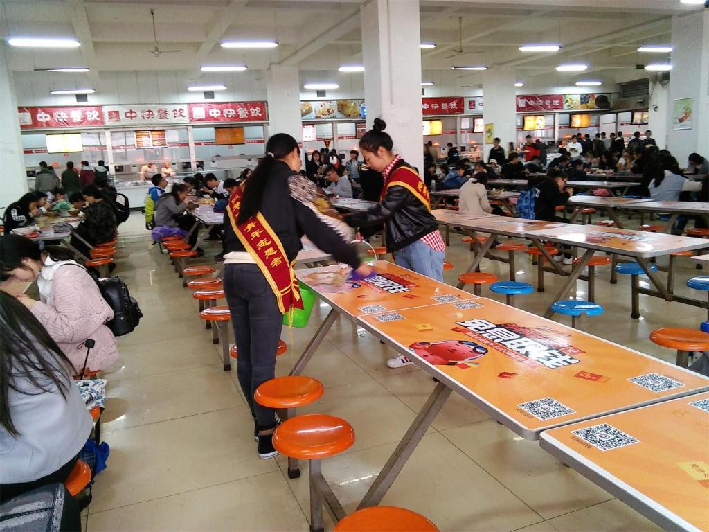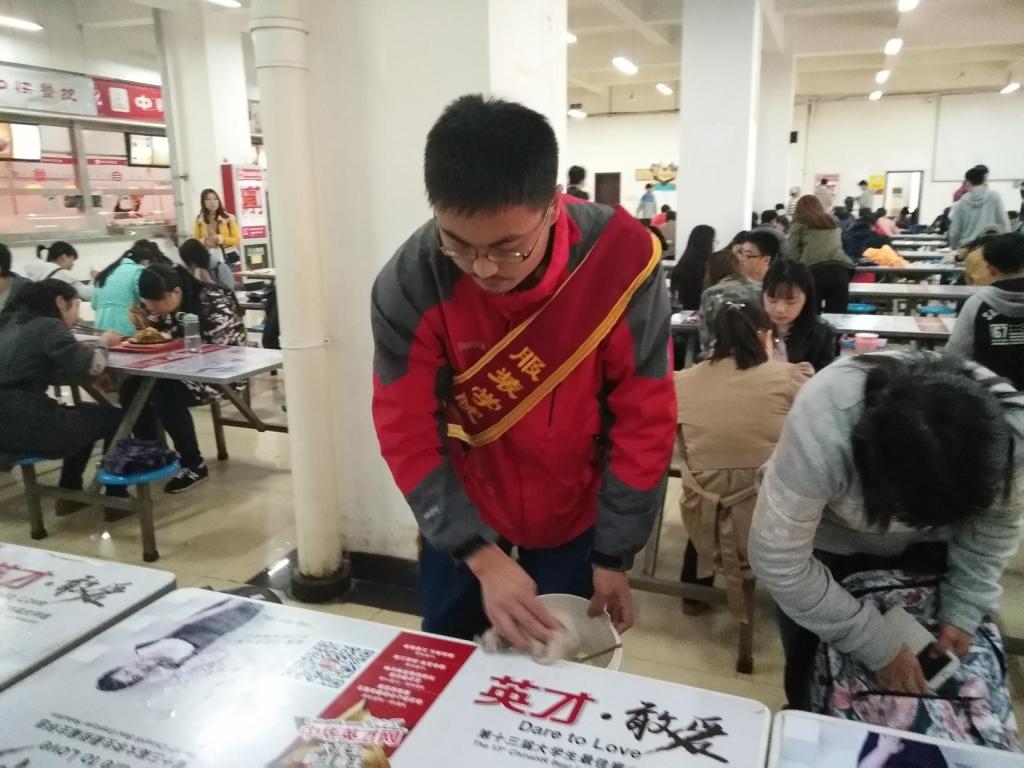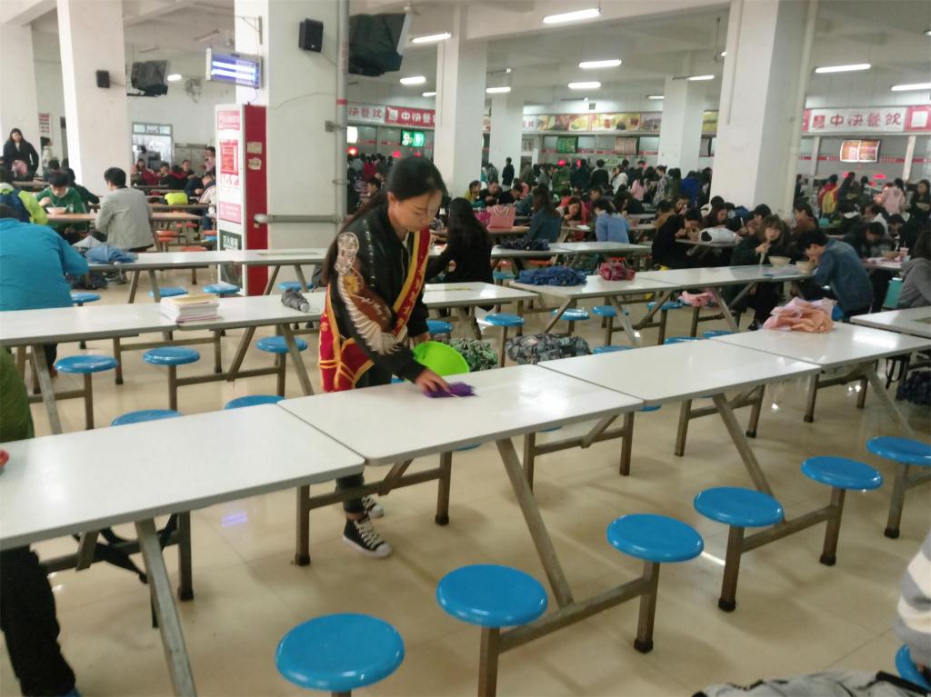 执勤时间为每日中午12点至12点30,下午6点至6点30。活动场地为食堂一二三层,每组5人,由青分队成员带领并分发绶带。志愿活动期间志愿者帮忙整理未端走餐盘,整理桌子,并且举止礼貌的帮助清洁阿姨完成清洁工作。展现了服装学院良好的文明形象。活动期间志愿者做到有组织,有礼貌,不玩手机,不扎堆,专心做好志愿活动。