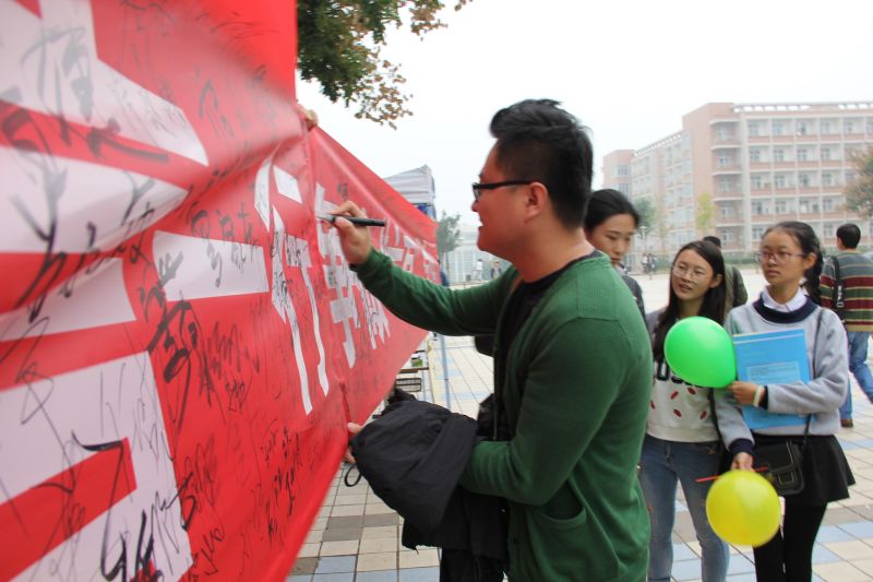 随后,全体学生观摩了宣传介绍“六有”大学生精神的视频内容,视频中讲述了俞敏洪自身坎坷经历及创业奋斗历程,激励广大学生坚信自己的目标,选择正确的方向并且为之奋斗。为了更好的将“六有”精神贯彻于校园以及每个同学的日常生活中,服装学院团总支随后于学校中心广场西侧举办了的争做“六有”大学生签字宣传活动,学生干部们拉起写着活动标题的横幅,并放置好精心绘制的海报。活动过程中,现场参加的同学们积极地在横幅上签下了自己的名字,带动了更多路过的同学们参加活动。