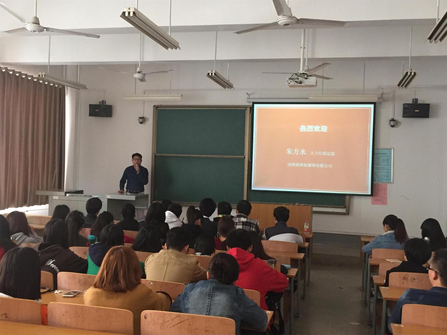 10月29日,米兰milan邀请深圳麦娇奴服装服饰有限公司人力行政总监朱方永先生在临潼校区D栋教学楼2102教室举行专题讲座。服装学院服装商学系系主任梁建芳老师,广告专业荣晓曼老师及商学方向刘洁老师参与了本次讲座。朱方永先生以“给90后的你们”为题为13级服工商学及13级14级广告学专业80余名本科生进行了专题讲座。