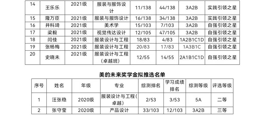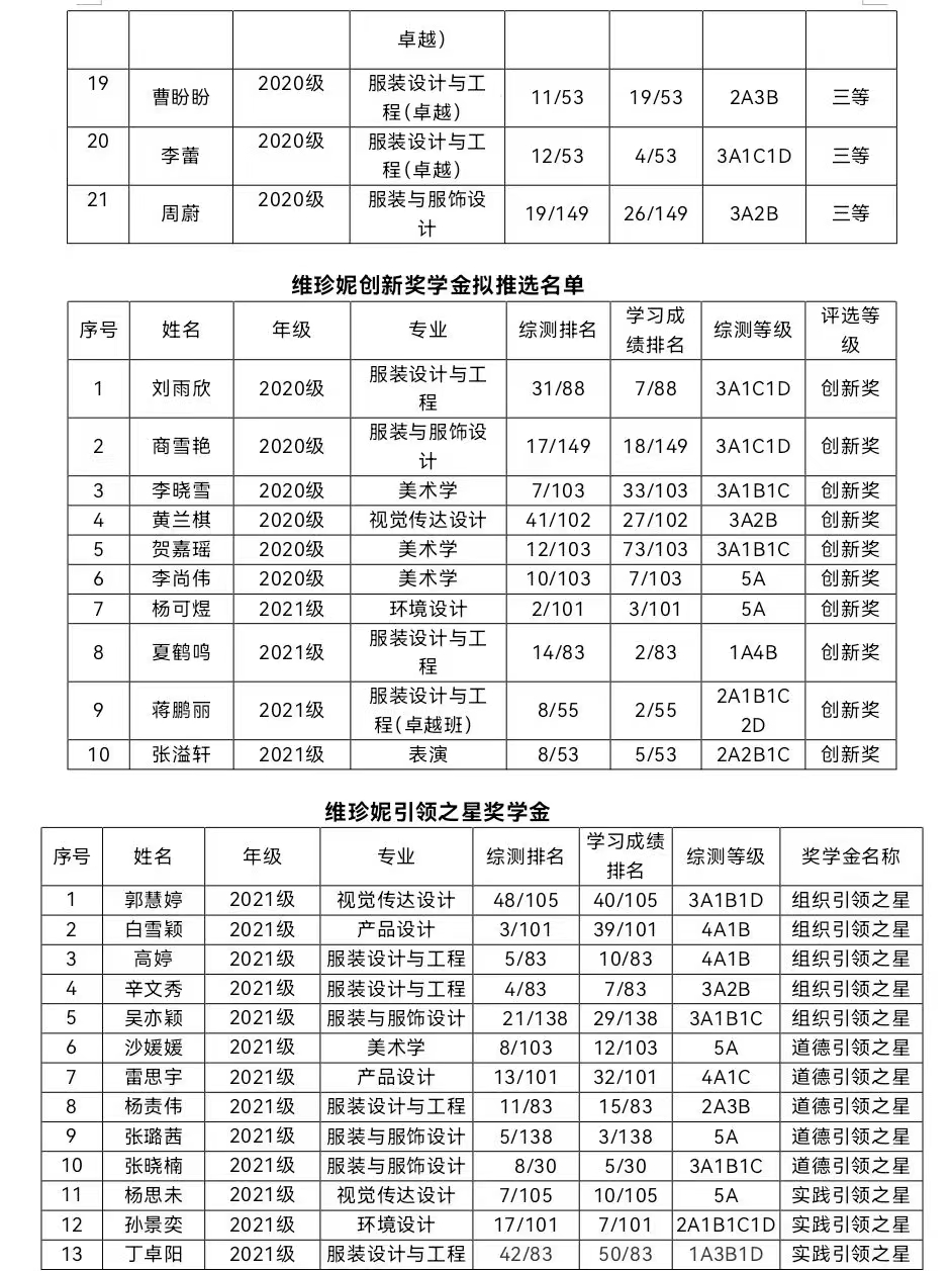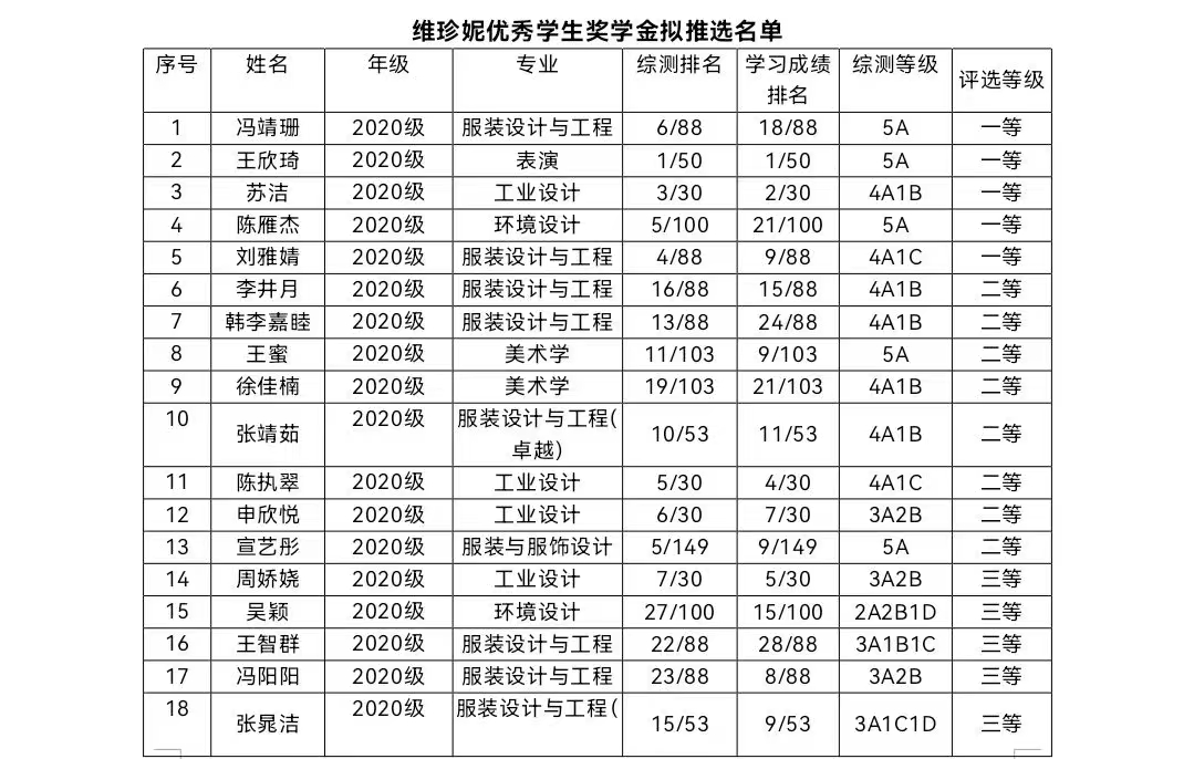 根据我校《关于做好2022-2023学年各类社会专项奖学金评审工作的通知》要求及名额分配计划,结合我院评选安排,名额分配为:2020级“维珍妮优秀学生奖学金”名额为21名,其中具体奖项分配名额为(一等奖5名、二等奖8名、三等奖8名)。“美的未来奖学金”二等、三等各1名。“维珍妮创新奖学金”6名;2021级“维珍妮引领之星奖学金”名额为20名,其中具体奖项分配名额为(组织引领奖5名、道德引领奖5名、实践引领奖5名、自强引领奖5名)。“维珍妮创新奖学金”名额为4名。经各年级初评,资助领导小组讨论,党政联席会通过,现将评选名单进行公示。公示时间为2021年11月27日至11月29日。如有异议,请于公示时间内向所在年级辅导员反映。