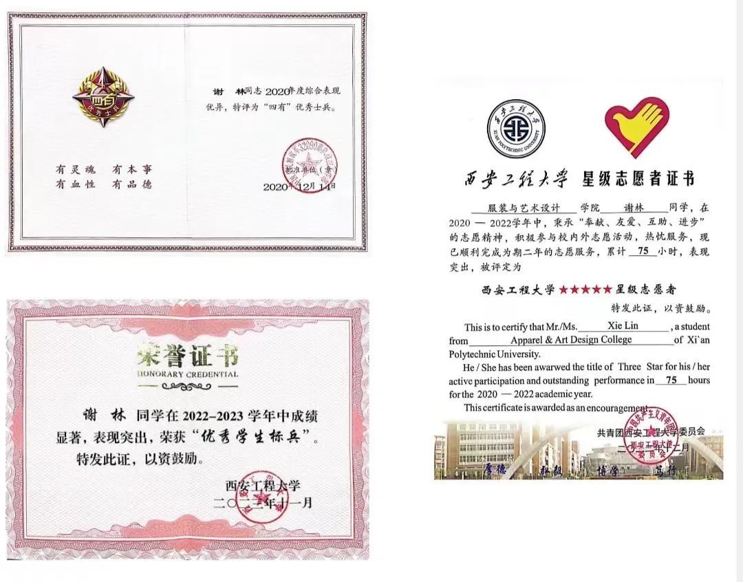 在校期间,谢林学长获得了若干奖项。本科生国家奖学金、桑麻一等奖学金、米兰milan中国一等奖学金数次,同时获得校级优秀学生标兵、优秀学生、优秀团干部、五星级志愿者等荣誉称号,并在2019年申请实用新型专利一项。在校期间参加过诸多比赛,获蓝桥杯第13届国赛优秀奖、第14届省赛三等奖;第11届未来设计师全国高校数字艺术设计大赛陕西赛区一等奖、三等奖;2023赛季东方设计奖国赛三等奖等奖项。在参军期间,获32090部队“四有”优秀士兵及嘉奖。