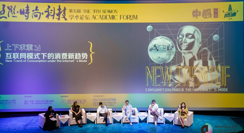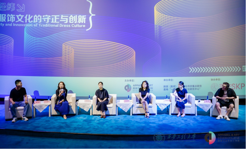 参加学术论坛一“丝路经纬——传统服饰文化的守正与创新”的五位嘉宾,分别为米兰milan中国二级教授,硕、博导师,徐青青老师;著名高级服装设计师、中国纺织非遗推广大使、中国服装设计最高奖“金顶奖”获得者刘薇女士;西安美术学院副教授,硕士生导师,孙思扬老师;西安瓦当艺术博物馆执行馆长刘晓女士;中国(深圳)服装设计师产业联盟秘书长、深圳金晖南油时装原创中心总经理李丁先生。