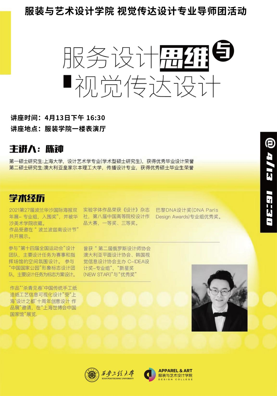 2023年4月13日下午,《服务设计思维与视觉传达设计》讲座于服装学院一楼表演厅举行。本次讲座由服装学院视觉传达系任晓辰老师主持,学院邀请西安美术学院设计艺术学院陈钟老师进行了两个小时的讲座分享。陈钟老师主要从事艺术与科技设计方向的教学和设计实践工作,现任西安美术学院艺术与科技系副系主任。第一硕士毕业于上海大学美术学院,并获得优秀毕业设计荣誉。第二硕士毕业于澳大利亚皇家墨尔本理工大学设计学院,并获得一等优秀硕士毕业生荣誉。并获得多个国内外专业设计比赛奖项,参与多个国内外政府与企业设计项目。服装学院视觉传达系教师、本科二、三年级的同学近100余人参加了本次讲座。