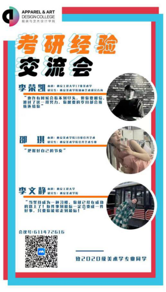 服装学院2020级美术学专业于5月10日晚9点召开线上2020级考研经验交流会,此次会议邀请了西安美术学院2022届毕业生邵琪,以及我院2021届毕业生李荣凯、2022届毕业生李文静参与主讲。该活动由2020级本科生“三全育人”导师团组织主办。