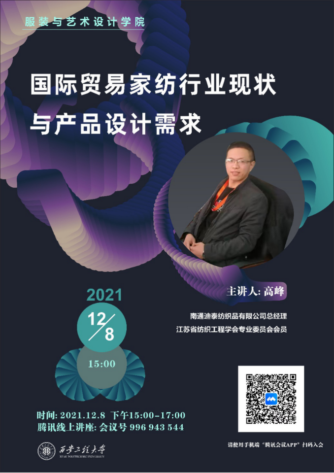 此次分享会高峰老师从家用纺织品行业运行分析、中国对外家纺贸易行业的挑战与机遇、家用纺织品专业人才素质及设计需求三个角度讲解,指出行业总体稳定向好,出口市场持续增长;中国外贸已进入新格局,对外贸易格局的稳定需要多方通力合作。作为家用纺织品设计师应具备全面的综合素质,扎实的理论基础用于实践研发,有对时尚敏锐的观察力和预见性,有好奇心、发明创造的能力,拥有自信心和感染力,对美学形态及周围文化环境的意义怀有浓厚的兴趣。