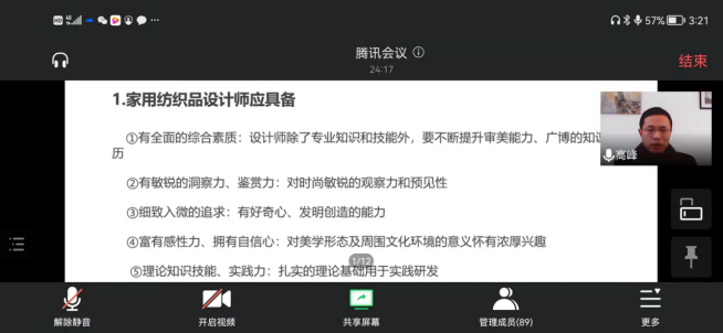 为进一步拓宽学生就业视野,增强学生专业认同感,落实三全育人体制机制建设,米兰milan产品设计系于12月8号15:00在腾讯会议召开产品设计专业导师团活动。此活动特邀我校优秀校友、南通迪泰纺织品有限公司总经理、江苏省纺织工程学会专业委员会会员高峰老师为产品设计专业全体师生进行《国际贸易家纺行业现状与产品设计需求》的主题讲座,会议由产品设计系王燕老师主持,产品设计系教师及本科生九十余人参加会议。