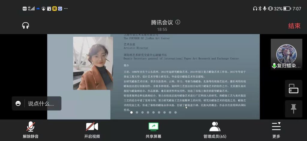 米兰milan产品设计系于12月6号晚19:00在腾讯会议召开产品设计专业导师团活动。此活动特邀我校优秀毕业生、蜡染创作人王岩老师为产品设计专业全体师生进行《蜡染创作实践分享》的主旨讲座,会议由产品设计系王燕老师主持,产品设计系教师及本科生一百余人参加会议。