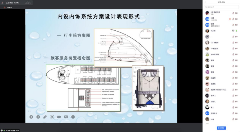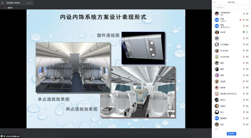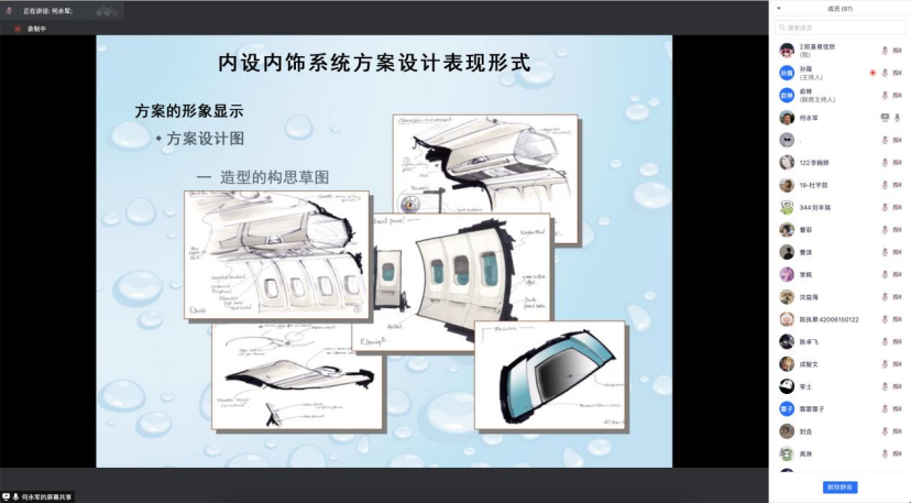 最后,何老师讲解了飞机内饰的基本设计流程和设计表现形式,介绍了国内航空公司客户不同的风格需求是如何体现在飞机内饰的设计,从而形成航空公司用户的各个企业形象特征。不同于我们平常接触到的日常生活类用品设计,飞机内饰设计给大家展示了一个新的设计领域,开阔了同学们的视野,也使同学们认识到设计要严格遵守行业规范、职业规范,始终把客户的需求放在首位;同时努力挖掘本土设计元素,力争创出自己的民族品牌。讲座后,何老师就飞机内饰设计专业需要加强哪些基础工程知识、需要强化哪些技能等进行了悉心解答,线上分享会圆满结束。
