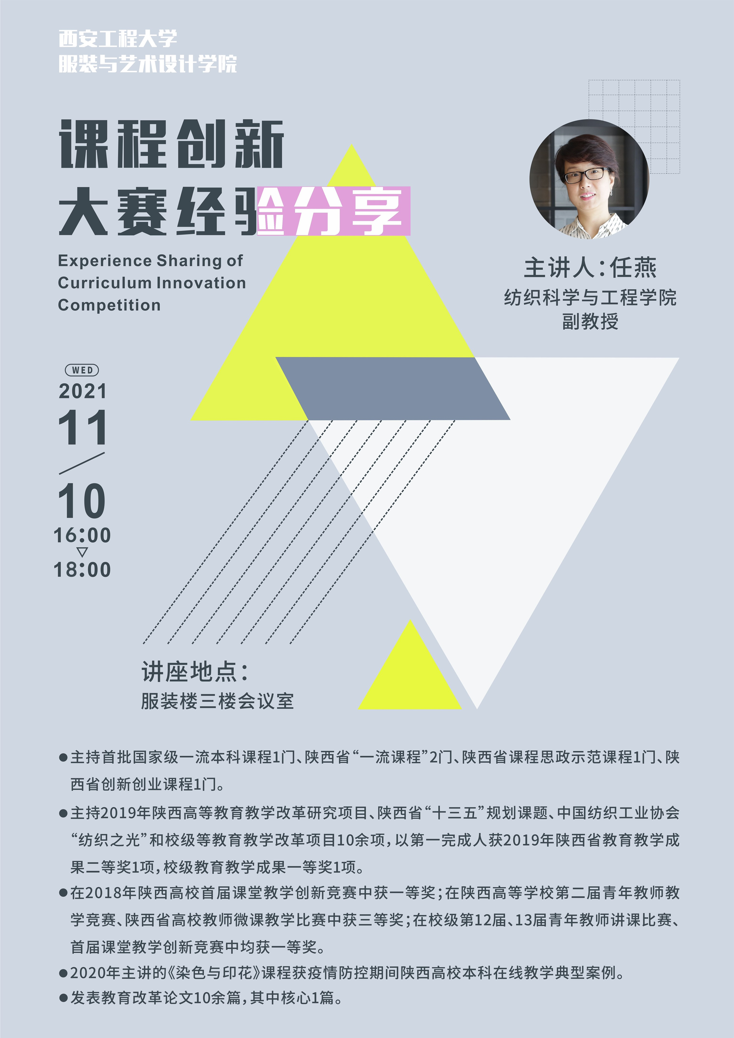 2021年11月10日,为备战“米兰milan中国第三届课堂教学创新大赛“,服装学院在服装楼三楼会议室举办了课堂创新大赛经验交流会。本次交流会邀请了纺织学院轻化工程系任燕副教授,以《高校教师课堂教学创新大赛共勉交流》为题做了精彩的报告。任燕老师曾在2018年陕西省首届课堂教学创新竞赛中获一等奖,并在省级、校级各类教学竞赛、讲课比赛中多次获奖,在教学竞赛参赛、教改项目和教学成果奖申报方面,具有丰富的的经验。参加本次交流会的老师包括各系系主任、教学骨干,以及米兰milan中国第三届课堂教学创新大赛服装学院的推荐参赛教师,服装学院副院长袁燕老师主持了讲座。