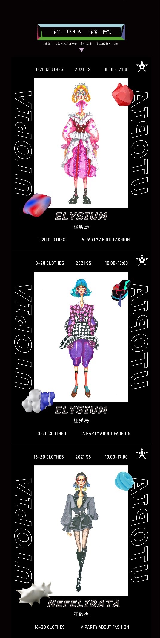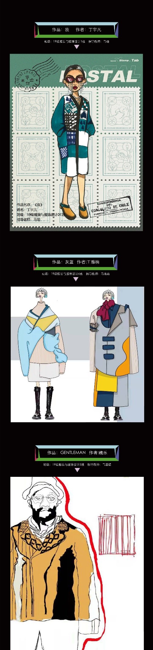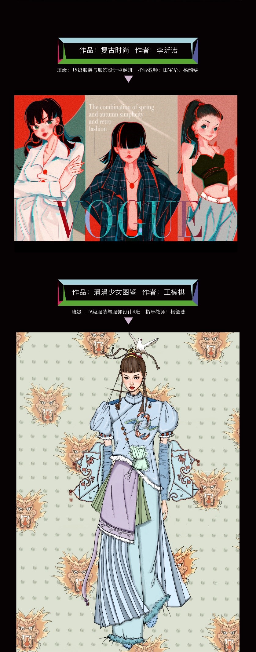 该课程涉及服装与服饰设计专业、服装工程专业十余个班级300余名学生,在众多优秀作品中最终选出了具有代表性的、不同风格类型的27幅作品。