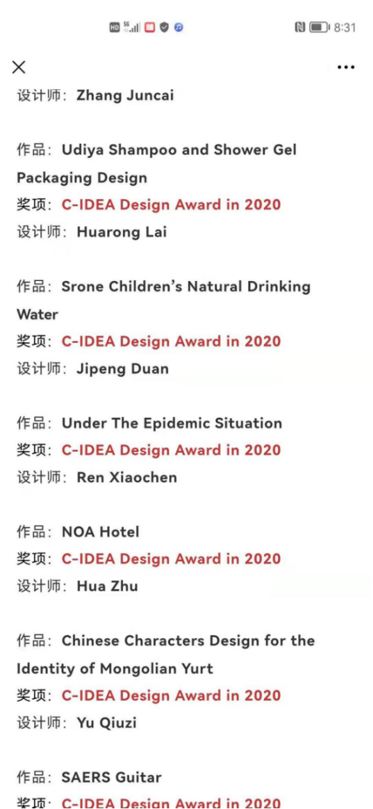 第三轮作品终评由C-IDEA 设计奖国际组织委员会-韩国视觉信息设计协会所组成的专家评委会在韩国进行了现场评审。由C-IDEA设计奖国际组委会主席大卫·布莱克洛克组织的国际设计专家在澳大利亚对终评评审结果进行了再次评议。最终评选出了2020年C-IDEA设计奖获奖者以及 2020年C-IDEA设计奖大奖、金奖得主。经过激烈的奖项角逐,我院青年教师任晓辰的作品荣获C-IDEA设计奖,7月获奖作品将在韩国首尔斗星纸业美术馆展出,9月将在波兰波兹南设计节上展出。