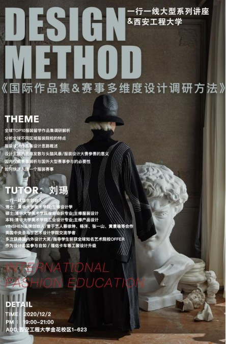 2020年12月2日晚上7点,服装学院服装与服饰设计系邀请一行一线联合创始人兼YINSHEN品牌创始人刘瑒老师,在金花校区1-623教室举办主题为《国际作品集&赛事多维度设计调研方法》的专业讲座,2019级服装专业共计100余名学生参加了本次讲座。