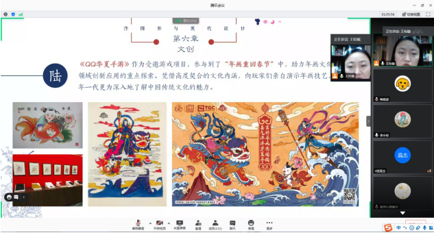 在讲座中,王怡璇老师分别就凤翔木板年画的历史、工艺、造型、色彩、设计创新以及传承保护策略几个板块做以讲解。利用大量珍贵的图片、文字资料向同学们多方位展示了凤翔木板年画艺术。讲座中关于凤翔木板年画的诸多问题引起了同学们的学习兴趣,在线上讲座过程中,王怡璇老师和同学们也通过连线互动的方式共同探讨了凤翔木板年画的艺术特色,当代设计传承等同学们感兴趣的问题。讲座后,王怡璇老师精彩的演讲引发了诸多同学的兴趣与思考,同学们纷纷提出了自己的问题,王怡璇老师也在线上为同学们耐心解答。讲座气氛热烈,在同学们中间引起强烈反响。