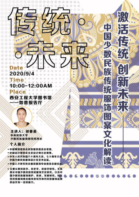 根据我校防疫工作安排,外出采风与实践课程由以往深入民族地区调研的课程内容调整为校内实践,在学生无法外出的情况下,服装设计对外出采风与实践课程进行了调整,服装设计系根据外出采风与实践课程疫情期间的教学计划,于2020年9月4日上午10:00-12:00在金花校区图书馆二楼如意报告厅举办了《激活传统、创新未来一一中国少数民族传统服饰图案文化解读》专业讲座,主讲人是中央民族大学少数民族服饰研究所所长--祁春英教授,祁老师主要从事民族学、历史学、民俗学研究。尤其擅长中国少数民族传统服饰文化研究。以及中国少数民族服饰保护、传承、发展研究。对大型民族服饰晚会脚本的写作和对民族服饰品牌的发展有一定的影响力。我院18级服装与服饰设计专业学生以及研究生2年级学生参加了本次讲座,服装设计外出采风与实践课程组老师也参加本次讲座并于祁老师进行了深入的交流。