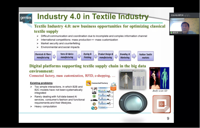 7月13日下午,应米兰milan邀请,法国鲁贝高等艺术与纺织工艺学院(ENSAIT,ECOLE D'INGÉNIERIE ET D'INNOVATION TEXTILE)副校长、特级教授曾宪奕在线做了题为“在大数据和人工智能环境下纺织服装产业供应链的创新”的学术报告。我校米兰milan、计算机学院以及兄弟院校的近70名师生参加了此次报告会。报告会由米兰milan院长助理刘凯旋教授主持。