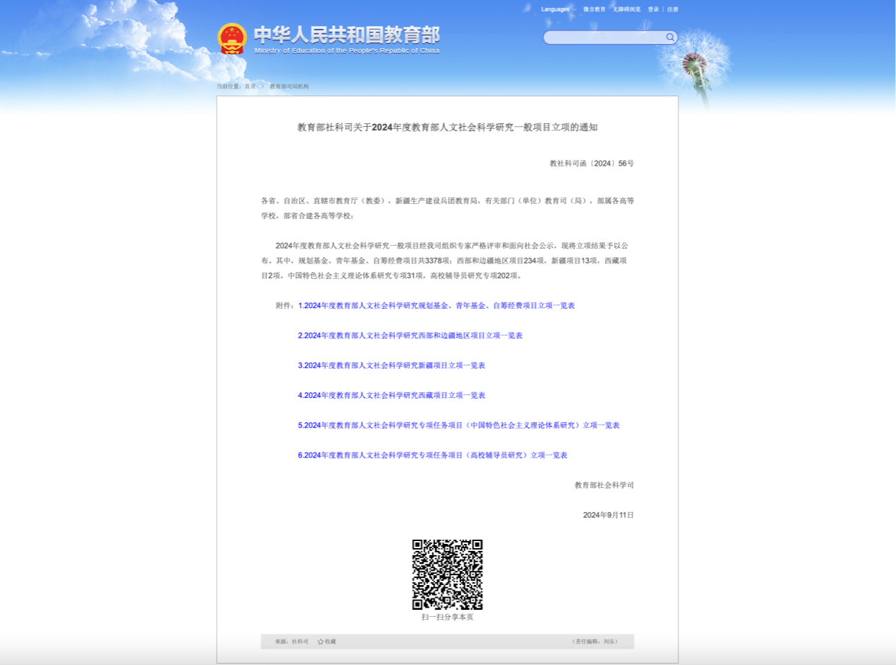 2024年度教育部人文社会科学研究规划基金、青年基金、自筹经费项目立项一览表 |