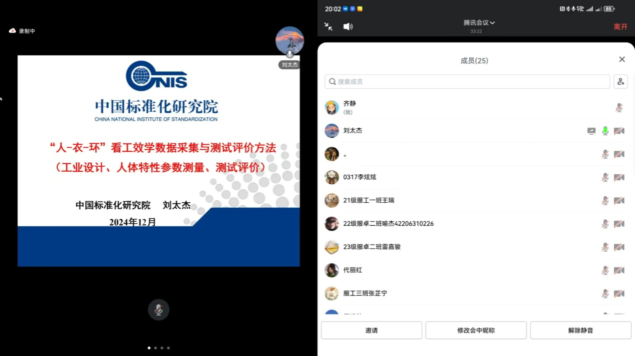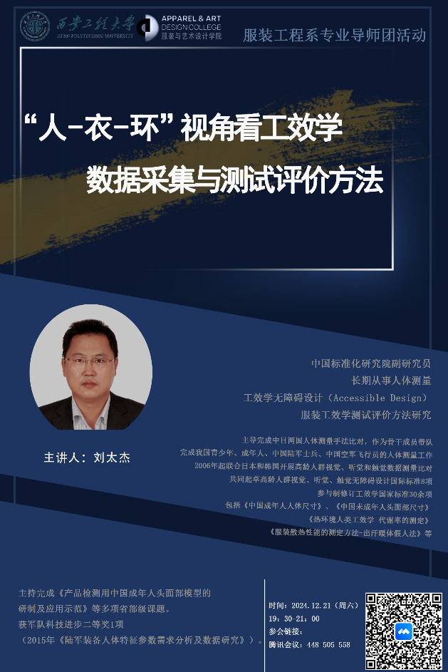 本次讲座特别邀请到来自中国标准化研究院的刘太杰副研究员担任主讲嘉宾,由服装工程系副主任吴龙老师主持。首先对刘太杰副研究员的到来表示热烈欢迎与诚挚感谢。刘老师深耕工效学领域多年,积累了丰富的科研与实践经验。在讲座过程中他围绕“人-衣-环”这一独特视角,深入浅出地阐述了工效学数据采集的关键要点。他指出,人作为穿着主体、衣物作为媒介、环境作为外在条件,三者相互作用,对工效学研究有着深远影响。通过现场展示与案例分析相结合的方式,详细讲解了如何精准采集数据,以及运用科学的测试评价方法来衡量人在不同穿着与环境下的工效表现。