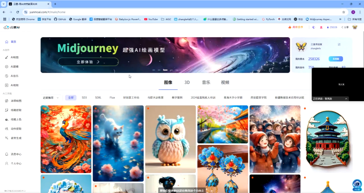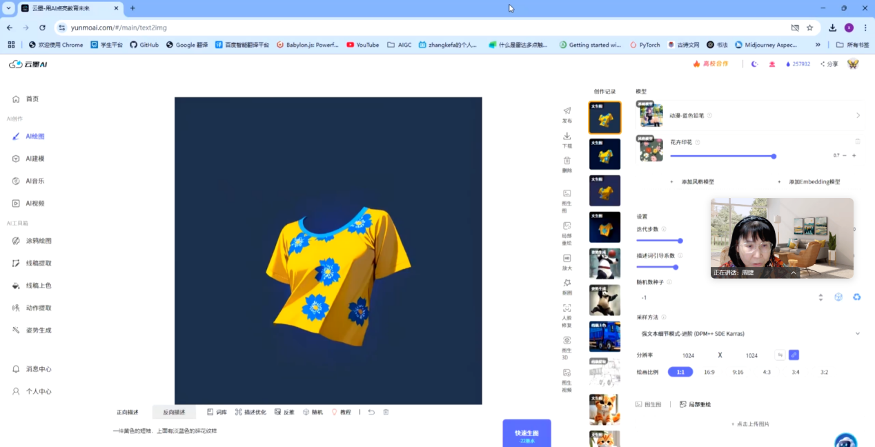 研讨会上,张克发先生详细介绍了云墨AI的四大核心功能,涵盖图像设计、3D建模、音乐音效制作、视频生成等多项智能创作工具。他重点讲解了AI图像生成、建模、描述词优化等技术在服装设计中的应用,助力款式开发、个性化定制、智能交互设计等创新实践。让师生们深入了解了云墨AI平台在设计创作中的实际应用。同时,会上还介绍了云墨平台计划接入的国产大模型,这将进一步提升图像生成的精准度和多样性,为服装设计提供更丰富的创作手段,拓展了师生们在智能设计方面的思路。此外,会议还分享了AI小模型训练在教育中的应用,展示了如时装设计、非遗蓝印花布AI模型等成功案例。
