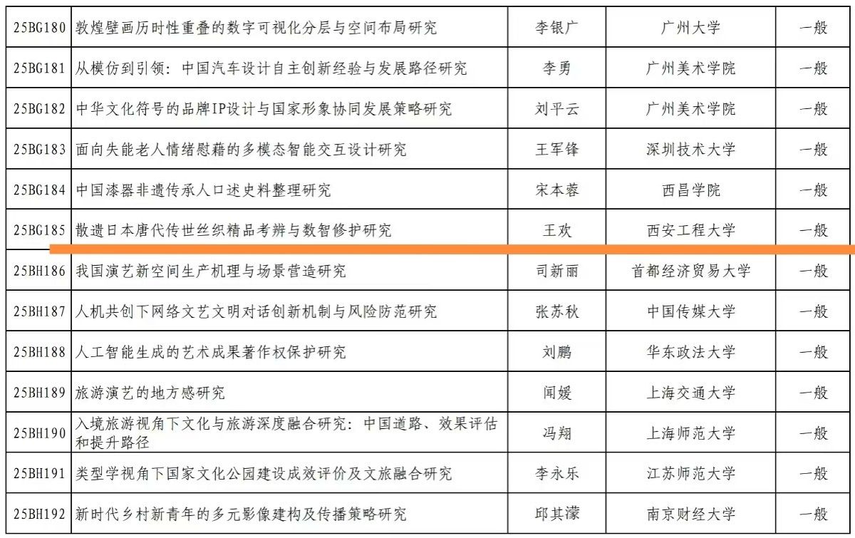 近日,2025年度国家社科基金艺术学项目立项名单正式公布。服装学院王欢副教授申报的《散遗日本唐代传世丝织精品考辨与数智修护研究》成功获批一般项目,实现我院在该高级别科研项目上的重要突破。
