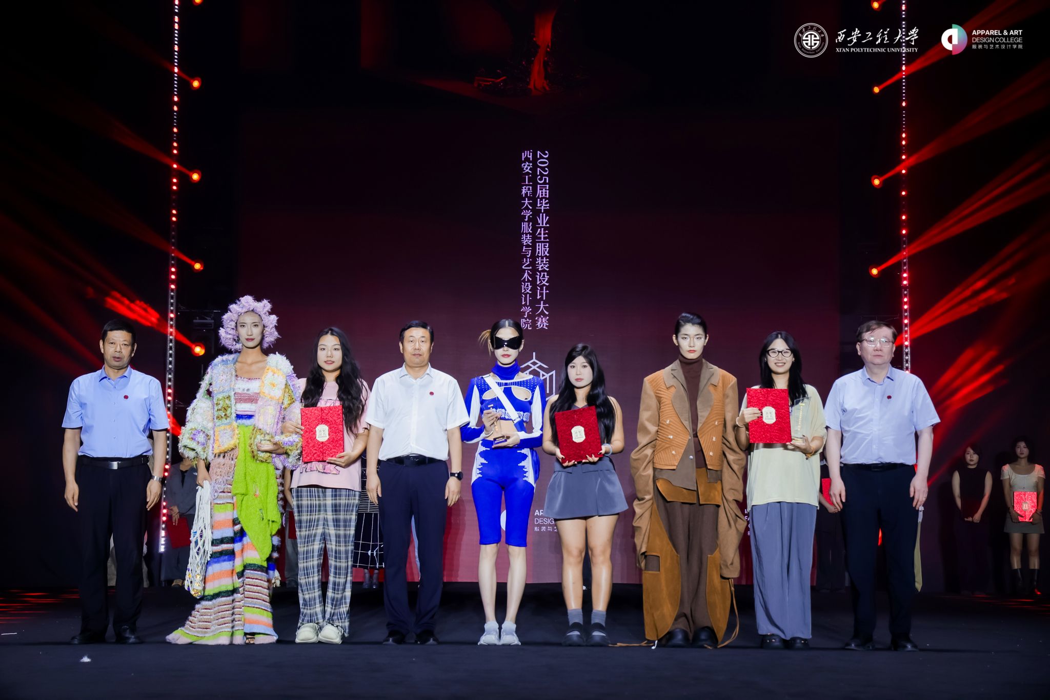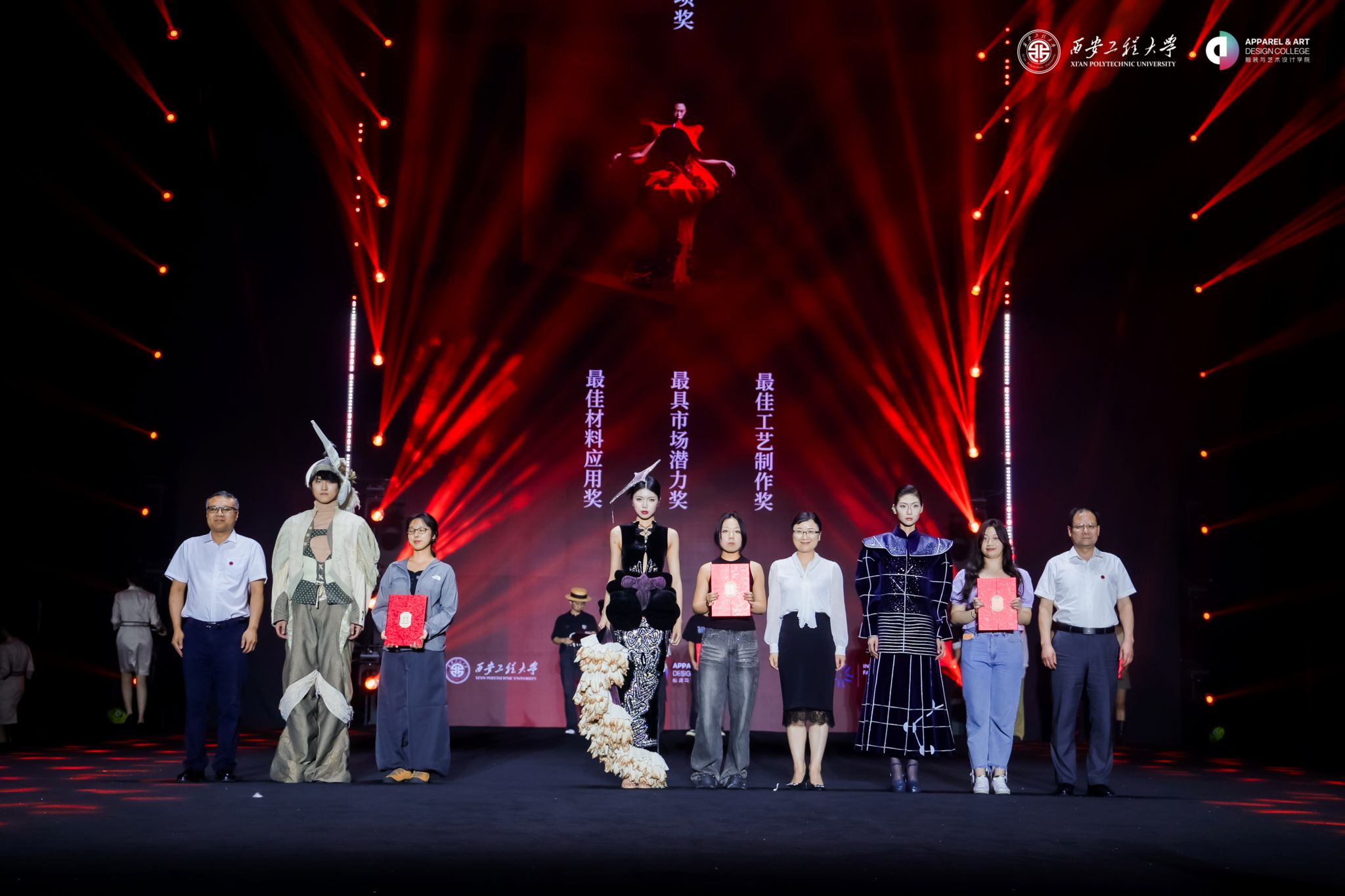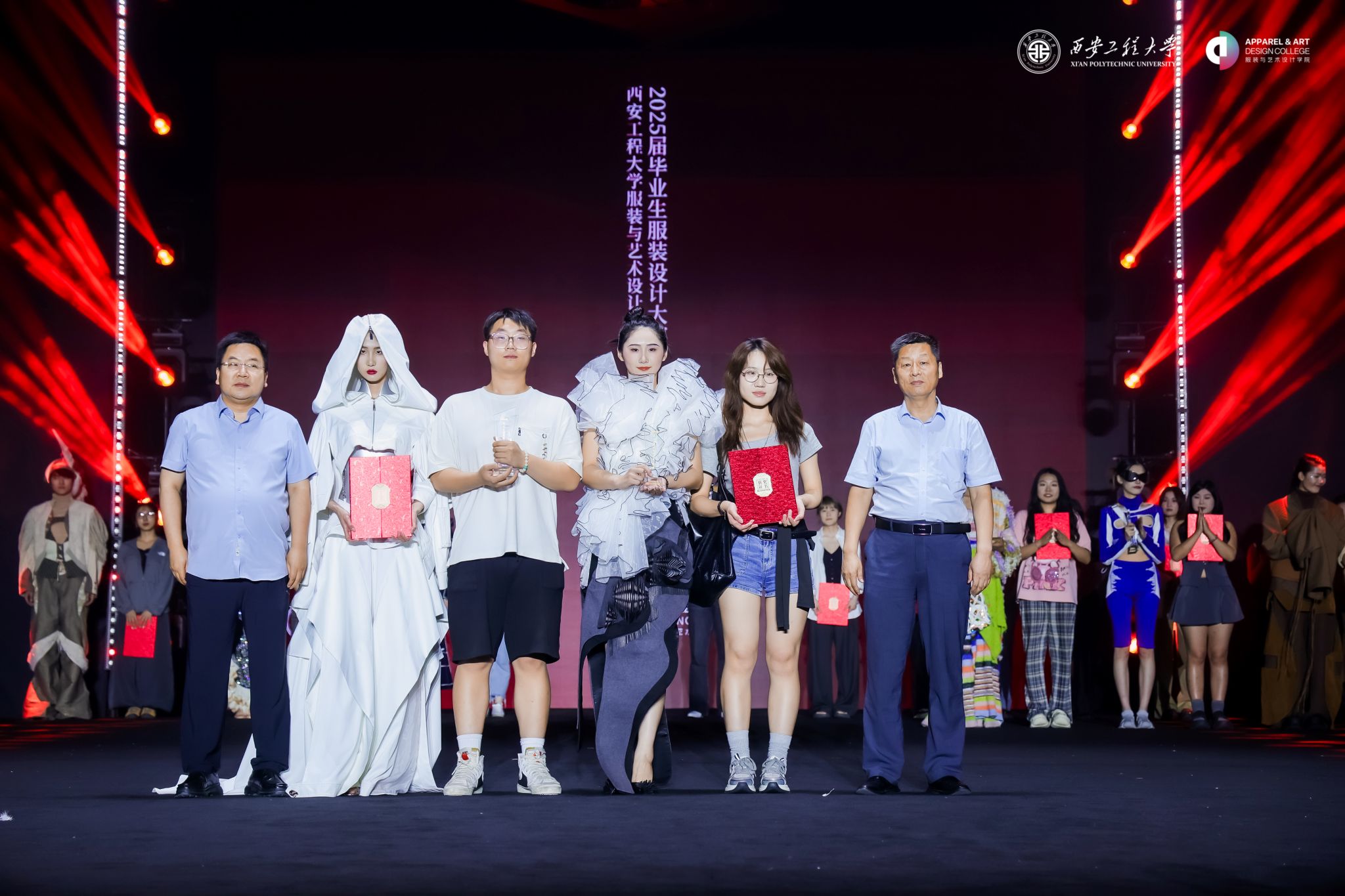 本次毕业设计的灵感源自《庄子・齐物论》,强调“万物齐一、共生平等”的哲思。毕业生们将“长安”这一文化象征与周秦汉唐四代的文化意象融入设计,构建跨越时空、融合古今的多元文化语境,激发社会对传统与当下、个体与世界的深度思考,充分展现学院“艺术+科技+文化”的育人特色。大赛邀请西安美术学院陈霞教授,上海未甲文化传媒有限公司总经理姜伟辉、西安唐晟玖合品牌管理有限公司董事长钱垚等业内专家担任评委。大赛最终评选出一等奖1名、二等奖2名、三等奖3名、优秀奖10名。校党委书记马万清为一等奖获得者李昊天颁奖;校领导为二等奖获得者张霄璇、徐丛鑫,三等奖获得者王乐乐、张珂清、张悦嘉,最佳材料运用奖获得者王芗泽、最具市场潜力奖获得者徐佳蕊、最佳工艺制作奖获得者黄祖铱颁奖;学院领导为优秀奖获得者颁奖。