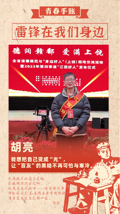 胡亮,如同他的名字那样,把自身焕化成一丝微光,穿破黑暗,为青年大学生树立良好的榜样,引导人生的方向;为视障人士照“亮”前行的路,点“亮”梦想的灯塔。