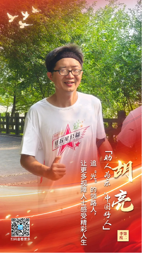 现如今,胡亮依然保持着每天跑步的好习惯,并且坚持组织每一周的助盲活动。在奔跑的过程中,他常常心里默默念着那再也看不清的80个字的入党誓词,这是他坚定的信仰。从追光到造光,他希望能够通过自己的故事,去帮助更多的人。